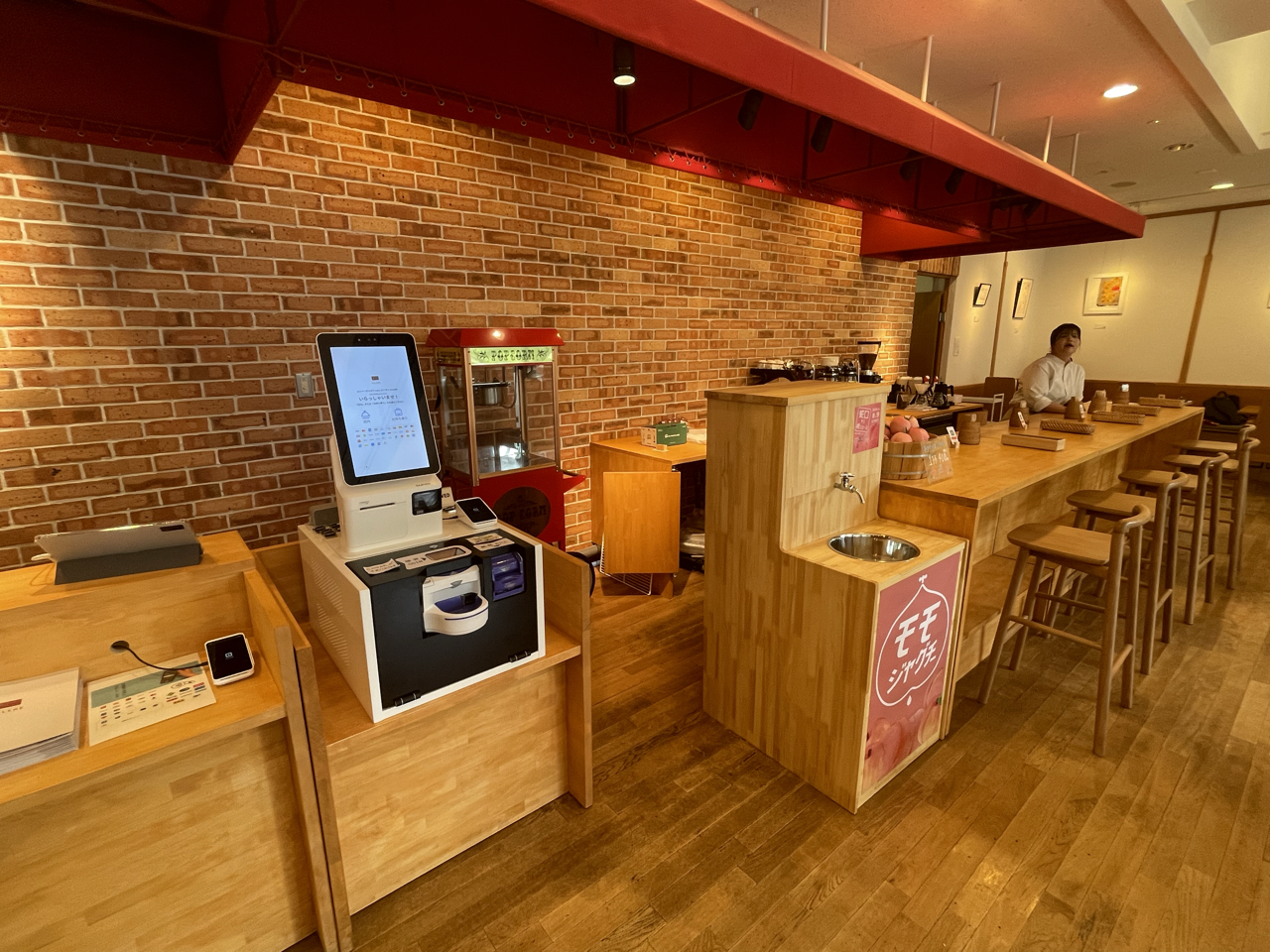 現金精算機と連動したキャッシュレス決済端末を常設、お客様自身が決済端末またはテーブルQRでご注文、お支払いを行うことで、スタッフのオーダー受付や対面でのお会計対応オペレーションを削減、美術館併設レストランならでは対面接客や、地元食材のご紹介などきめ細やかなご案内を実現しています。