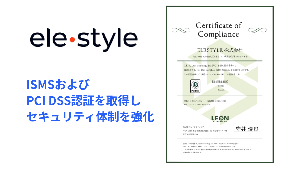 ELESTYLE株式会社(本社:東京都台東区、代表取締役:盧 迪)は、2024年12月25日付で、情報セキュリティマネジメントシステム(ISMS)に関する国際規格「ISO/IEC 27001:2022」および「JIS Q 27001:2023」に基づくISMS認証を取得しました。また、クレジットカード業界の国際的なセキュリティ基準である「PCI DSS(Payment Card Industry Data Security Standard)」のVer.4.0も取得したことをお知らせいたします。