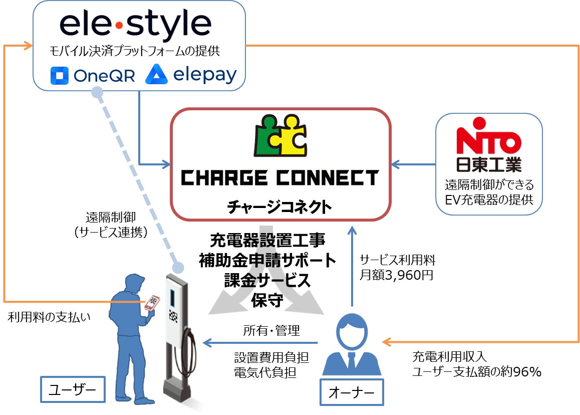 南海電設が提供するEV充電サービス「チャージコネクト」は、EV充電器の販売から設置工事、課金決済サービス、補助金申請サポート、設置後の保守までがパッケージとなっており、誰でも簡単に低コストでEV充電ステーションの運営者になることができるサービスです。設置先としては、ホテル・旅館などの宿泊施設、レストランやショップなどの商業施設、月極あるいはコインパーキングなどの駐車場、マンションなど集合住宅での共用充電器など、様々な場所での料金を徴収するEV充電提供にお使い頂けます。主な特長は以下の通りです。