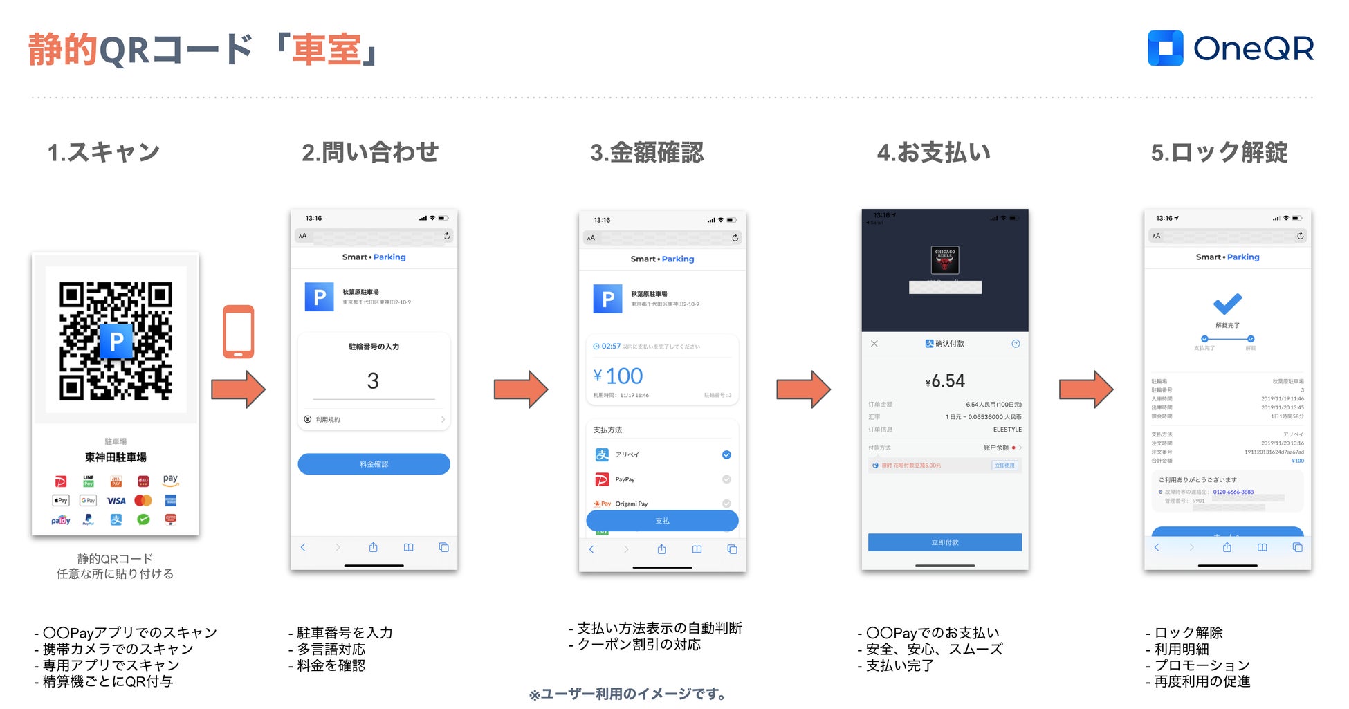 https://oneqr.io/]「OneQR」は、1つのQRコードをトリガーにした汎用モバイルアプリSaaS。開発が一切不要で、1つのQRコードだけで、複数のキャッシュレス決済に対応した様々なサービスの提供が可能です。